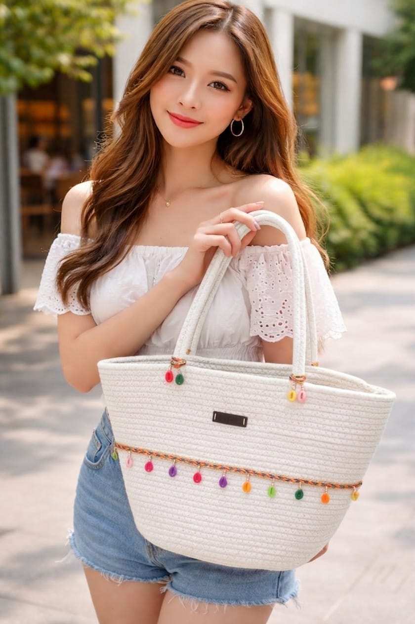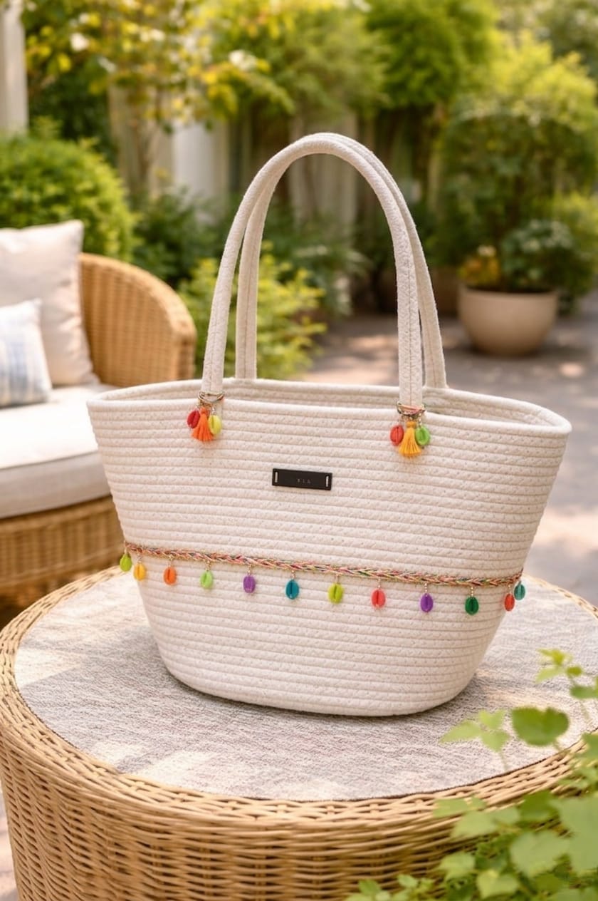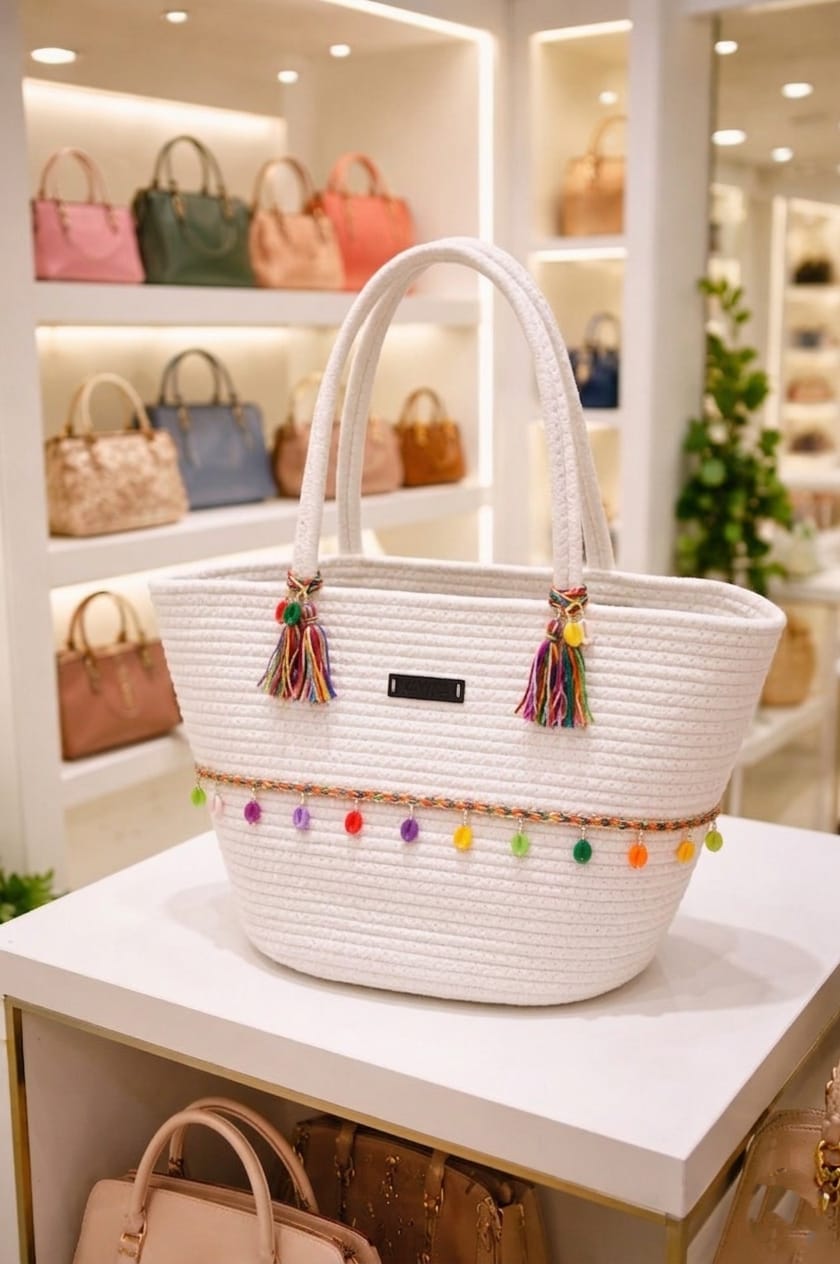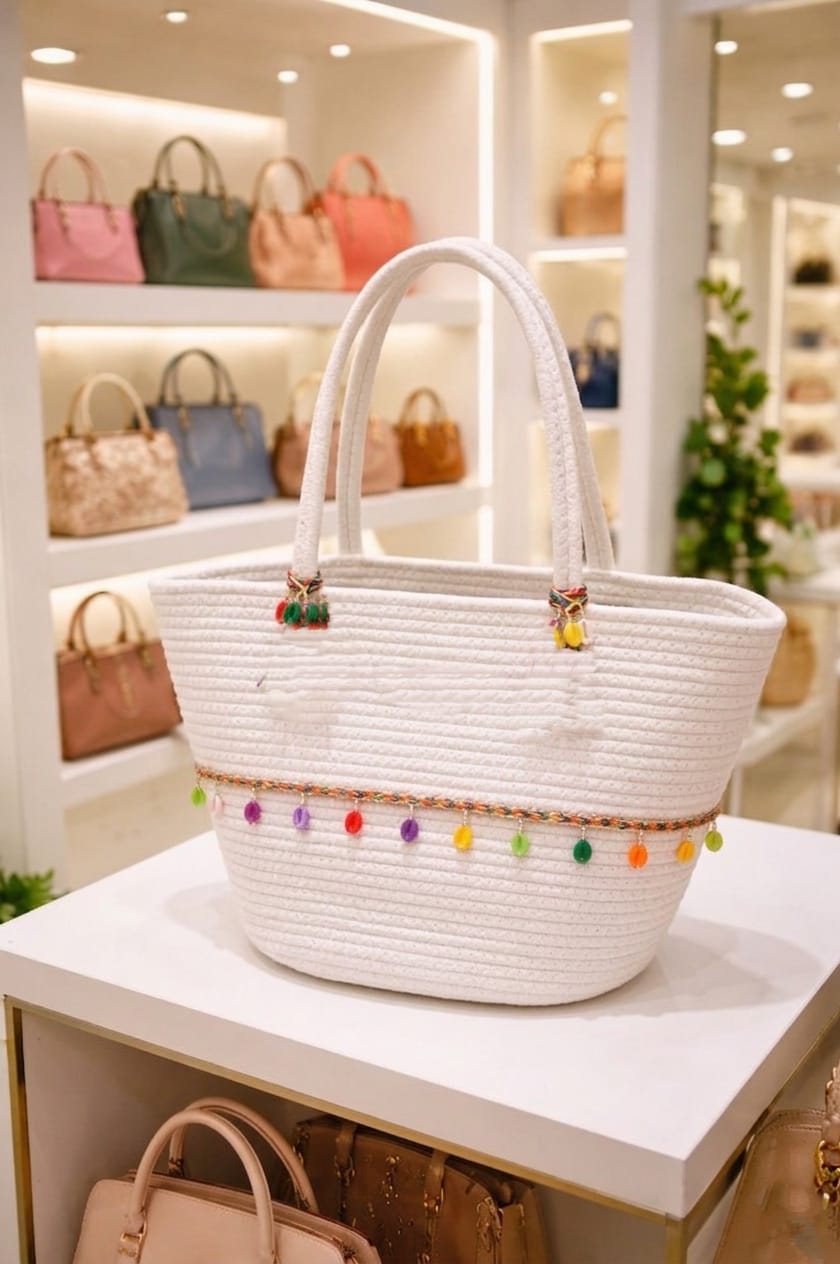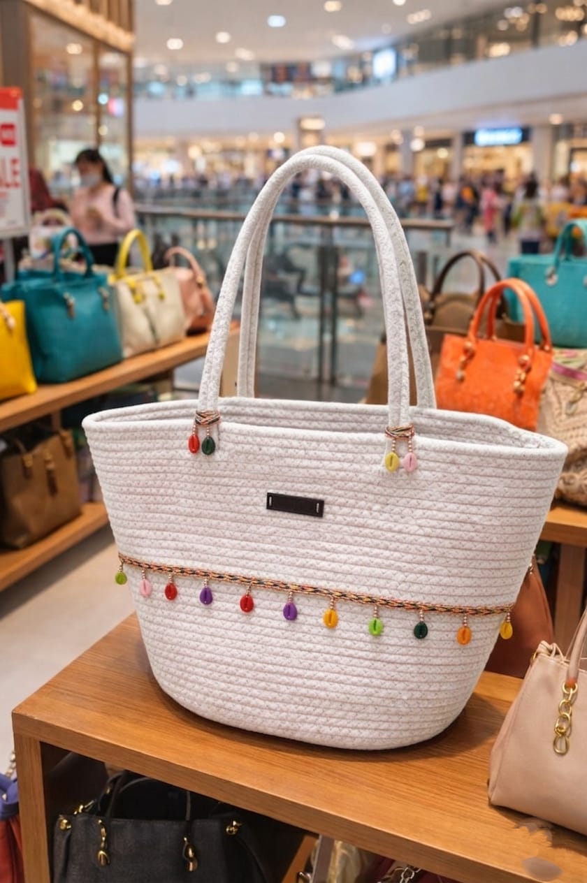 A BANTRICK This stylish cotton rope handbag is handcrafted from high-quality natural cotton, giving it a soft texture and a durable finish. Designed with a sturdy cotton strap, it is comfortable to carry and perfect for everyday use. The woven rope design adds a modern, eco-friendly touch, making it ideal for casual outings, shopping, or beach days. Lightweight yet spacious, this handbag combines practicality with timeless style.“COTTON ROPE” appears to refer to a crocheted/crochet‑style handmade bag/handbag made with cotton or similar materials. Many are marketed as eco‑friendly / boho / beach / market bags, often with granny square designs, floral motifs, off‑white or neutral colours. They often have one main compartment; some have a couple of inner compartments or pockets. Most Crosia bags are handcrafted with 100% cotton fabric / yarn. Sometimes there is a lining inside (cotton or mixed). Crochet/granny‑square motifs or floral granny squares joined together. Some have solid crochet pattern.