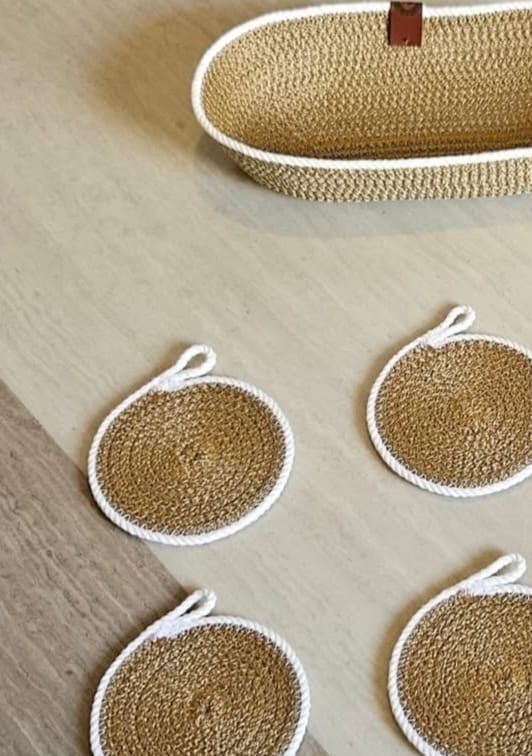 Bantrick design and style to suit your home.A cotton rope mat is a handmade or machine-made mat created by coiling or knotting cotton rope into various patterns. It’s often used as a decorative, functional item for entryways, bathrooms, kitchens, or outdoor settings due to its natural texture and aesthetic appeal.Material: 100% cotton rope, making it soft, durable, and eco-friendly.Designs: Commonly available in braided, coiled, or knotted styles (e.g., sailor’s knot or spiral coil).Usage: Doormats, bath mats, trivets, pet mats, or decorative table mats.Maintenance: Usually washable (hand or gentle machine wash), though some may need spot cleaning.Sizes: Vary widely — custom sizing is often possible if handmade.