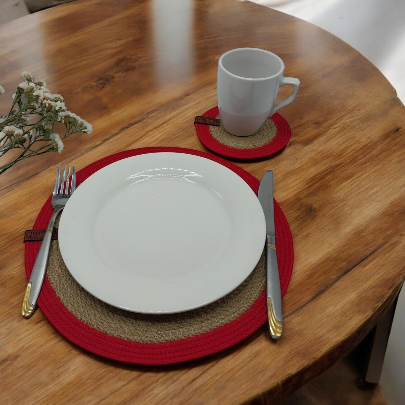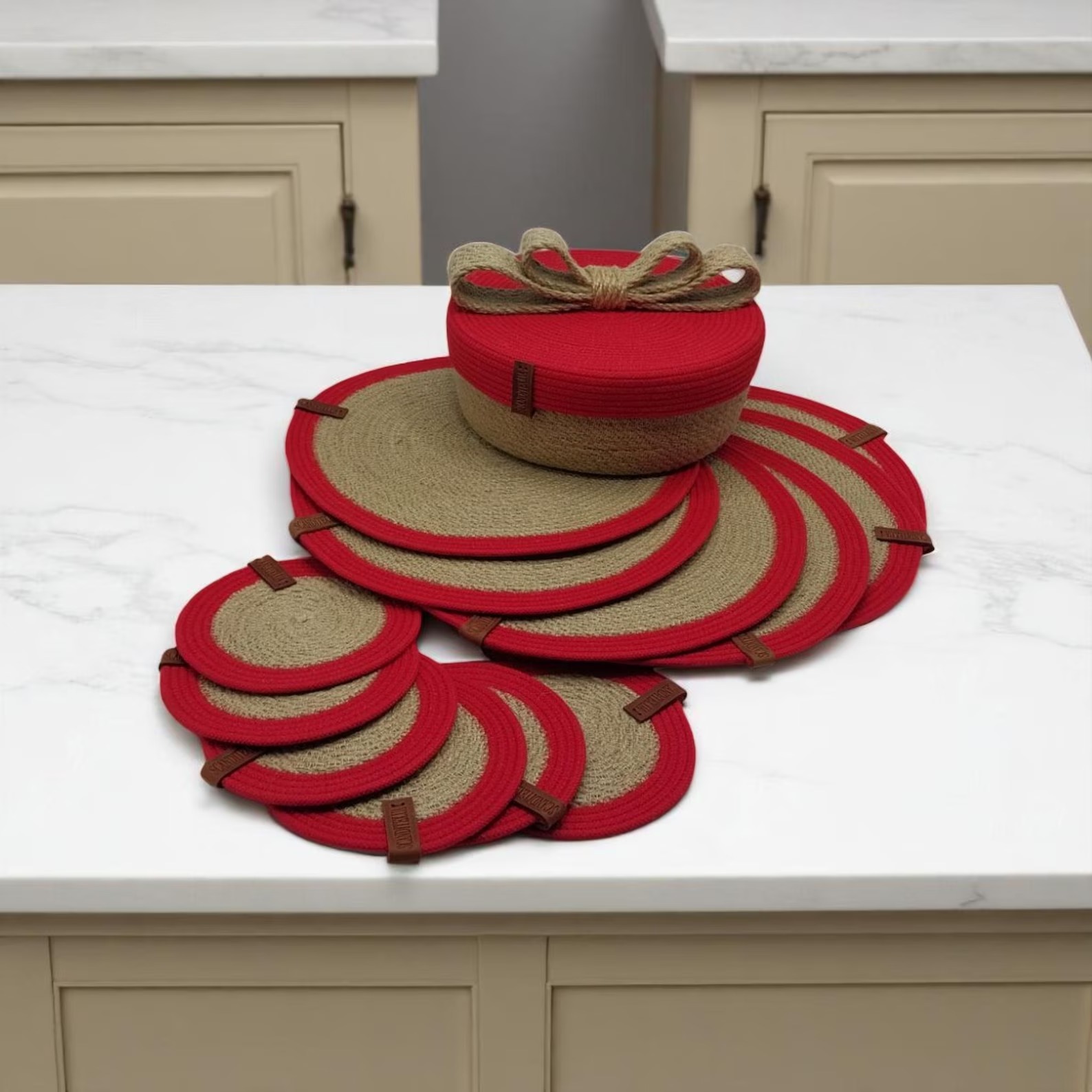 A Bantrick cotton rope mat set—typically these are placemat-style mats crafted from cotton rope, often laid out in placemat/coaster configurations or coiled patterns. Materials: Predominantly made from 100% cotton rope, sometimes combined with jute for added texture and strength. Construction: Handcrafted or machine-made in circular (spiral/coiled) or occasionally oval shapes. Care: Spot clean; occasional machine wash, dry flat, steam iron if needed