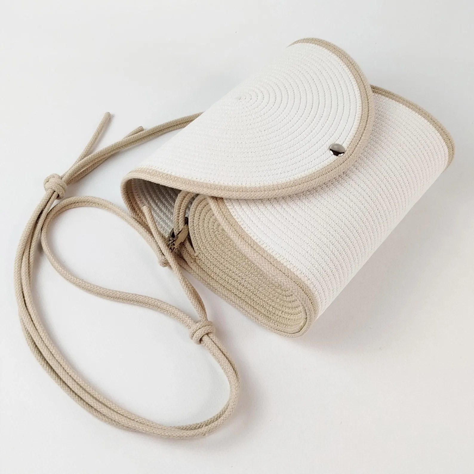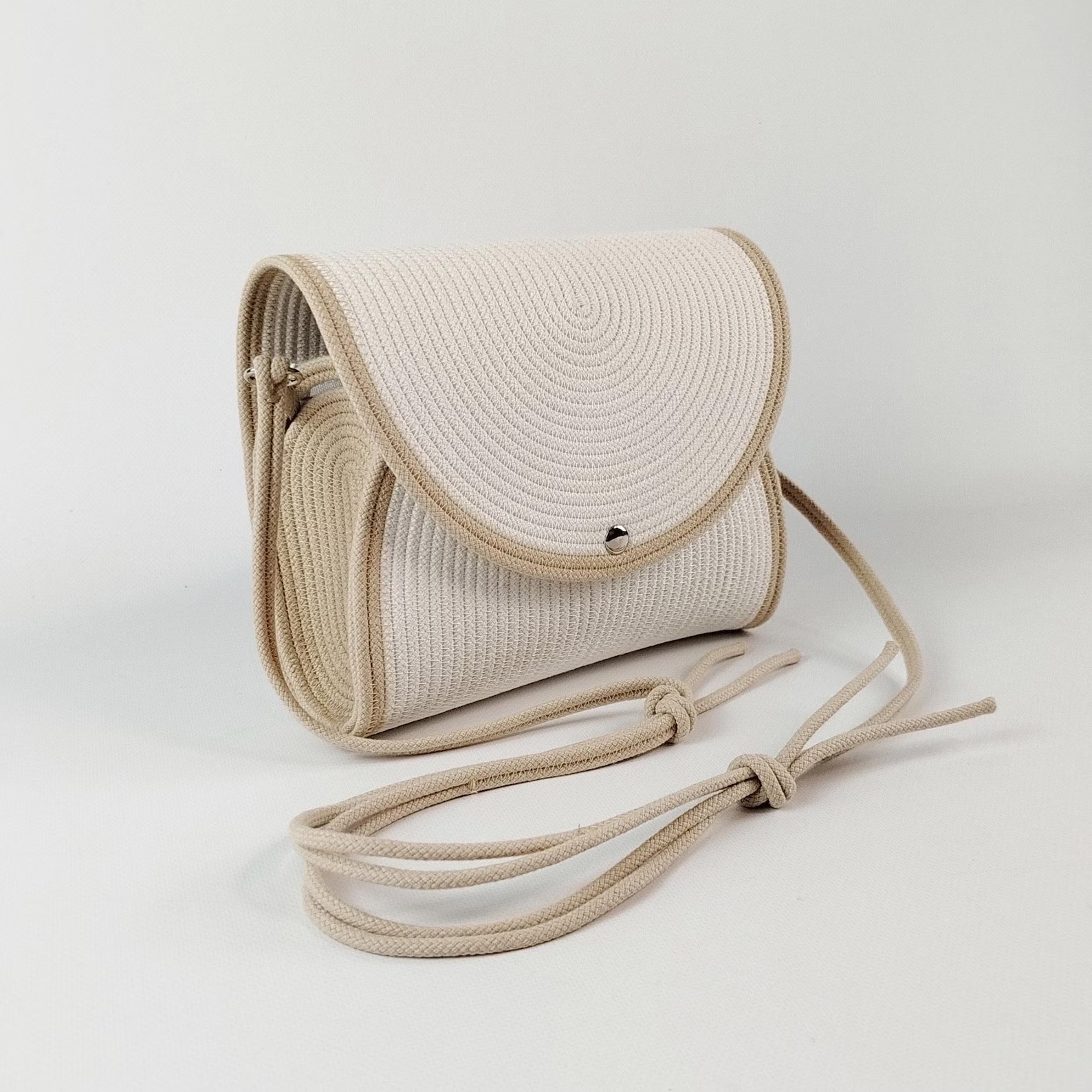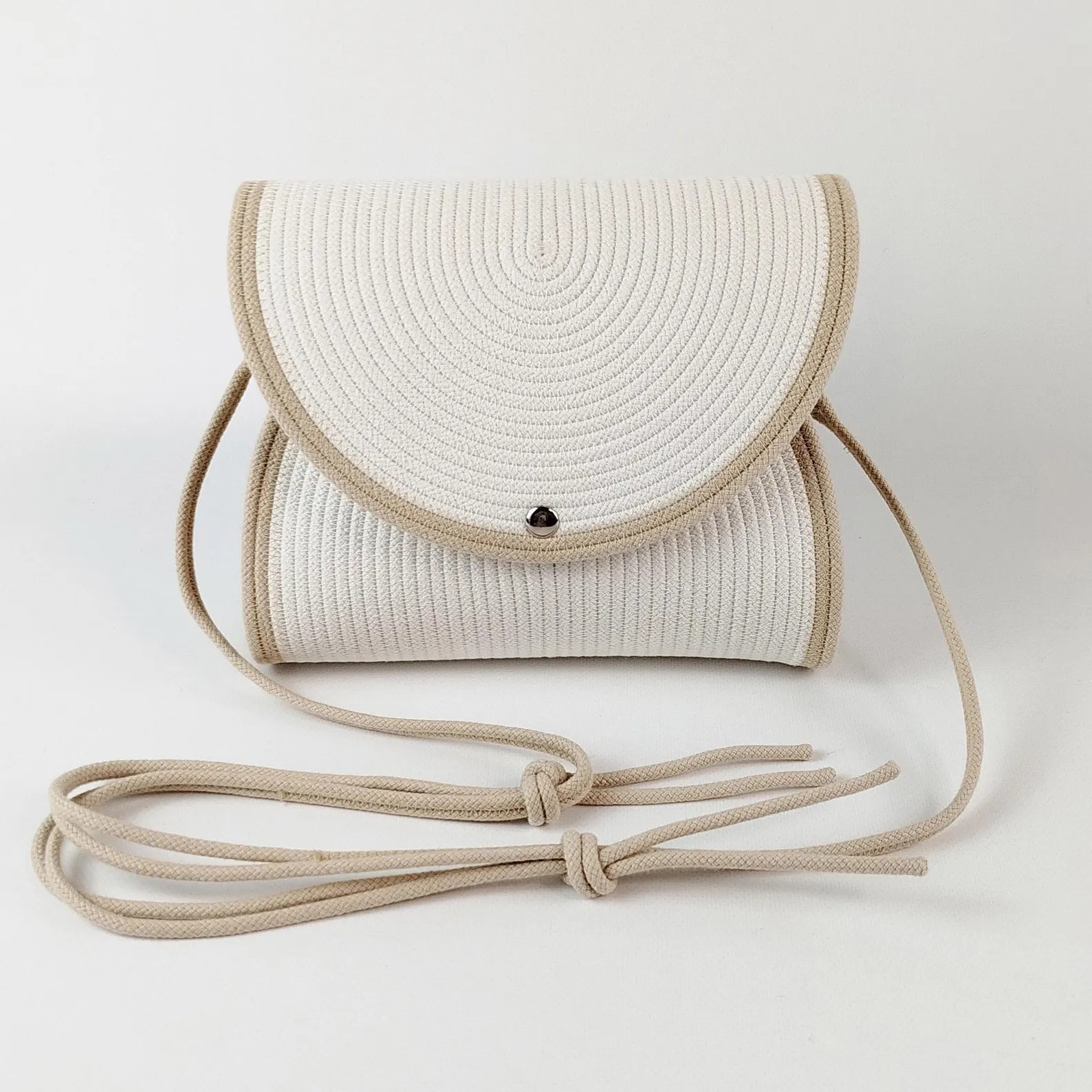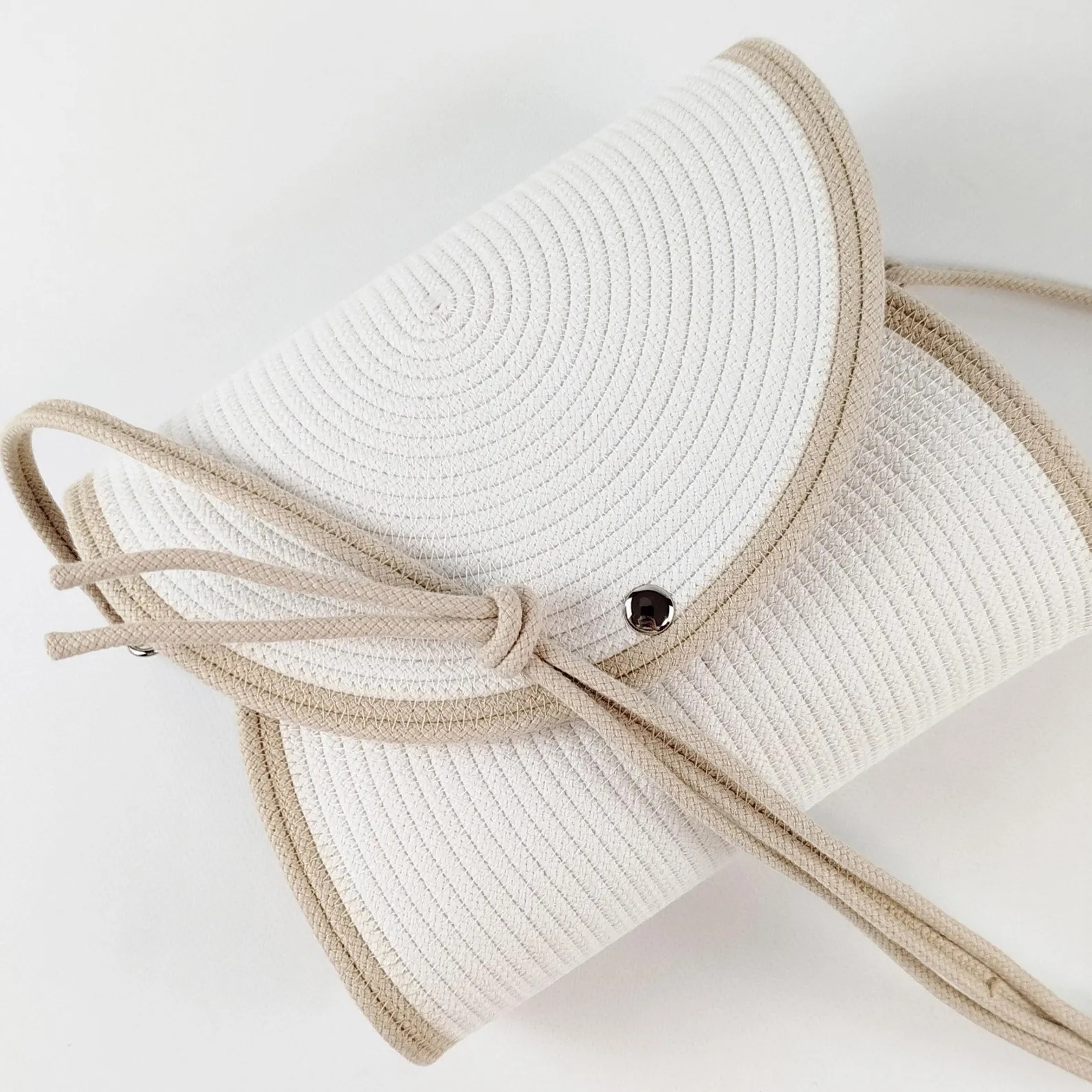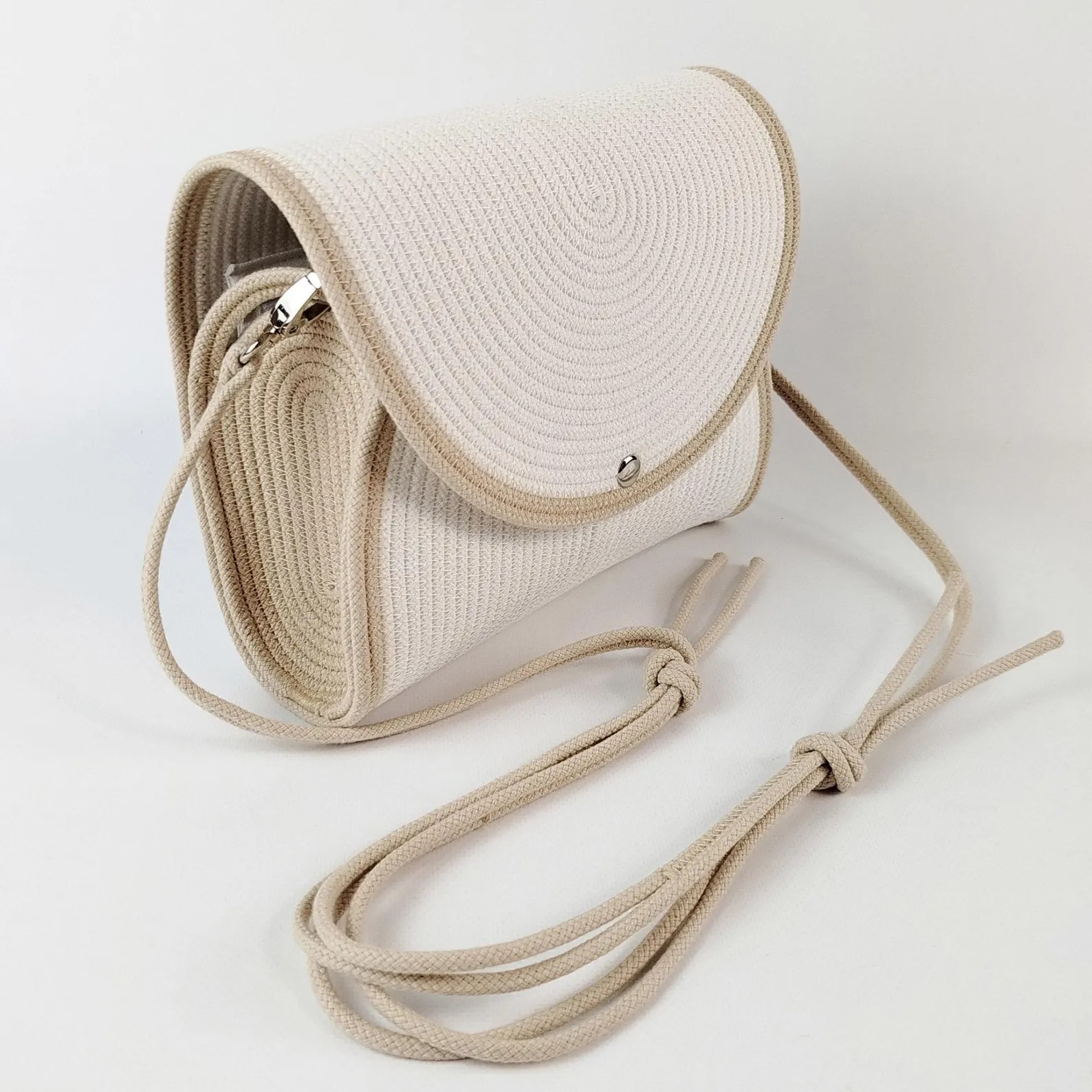 A Bantrick cotton rope handbag—a charming boho-style tote made from woven cotton rope, typically lightweight and ideal for casual outings. A beautifully handmade round sling bag with zipper pocket and eco‑friendly packaging Hand‑made with a cotton rope structure, internal pocket, and recycled packaging. Hand‑made with a cotton rope structure, internal pocket, and recycled packaging.