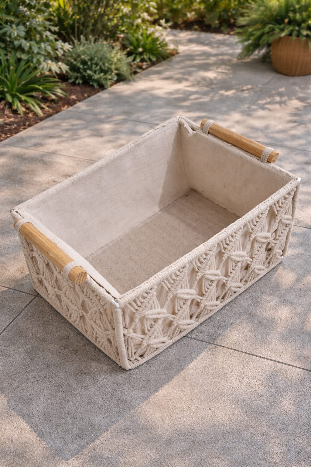A BANTRICK ;Handcrafted with care, this beautiful macramé basket is made using high-quality cotton cord, featuring intricate knot patterns that add a touch of bohemian charm to any space. Perfect for organizing small items, holding plants, or simply enhancing your home décor, this basket combines functionality with artisanal elegance. Its soft yet sturdy structure ensures durability while maintaining a natural, eco-friendly appeal. Ideal for living rooms, bedrooms, or gifting, this macramé basket brings warmth and texture to modern and traditional interiors alike.This charming small macramé basket is beautifully handcrafted using soft, durable cotton cord. Designed with delicate knot detailing, it adds a subtle boho touch to any space. Perfect for storing small essentials like keys, jewelry, makeup, or office supplies, it keeps your space organized in style. Its compact size makes it ideal for shelves, bedside tables, or desks. Lightweight, eco-friendly, and versatile, this basket is both practical and decorative—perfect for everyday use or as a thoughtful gift.