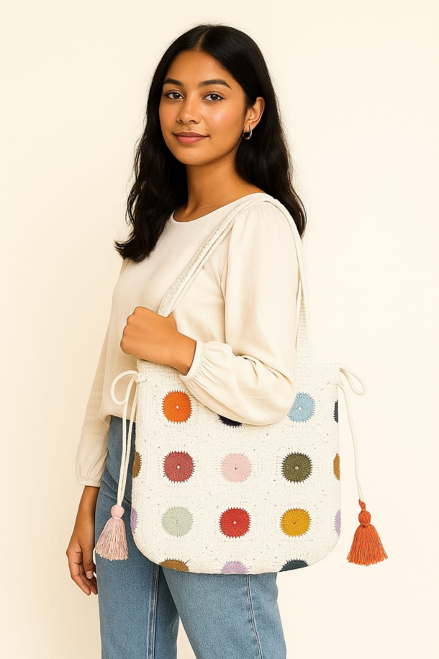 A BANTRICK A macramé handbag is created by knotting cords in various patterns (like square knots, lark’s head, and spiral knots) to form the bag’s structure. These bags can vary in size, shape, and complexity—from minimalist totes to intricate clutches.Boho Style: Complements beachwear, summer outfits, and festival looks Boho Style: Complements beachwear, summer outfits, and festival looks Eco-Friendly: Often made with sustainable materials Lightweight: Easy to carry Artisanal: A statement of craftsmanship