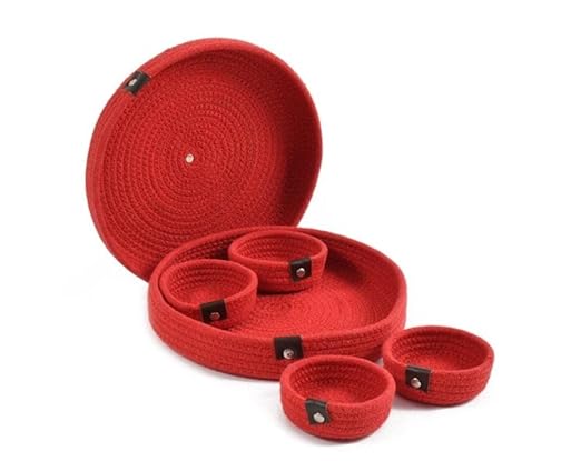 red cotton natural homemade rope dry fruit container with lid and serving tray for your home & kitchen (1 lowertray, 4 bowl, 1tray cover)Red Cotton Natural Homemade Rope Dry Fruit Container with Lid And Serving Tray For Your Home & Kitchen (1 LowerTray, 4 Bowl, 1Tray Cover)